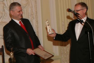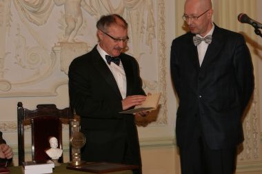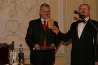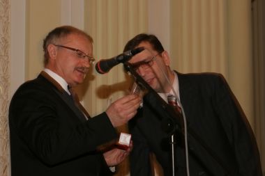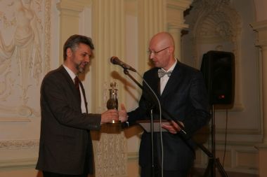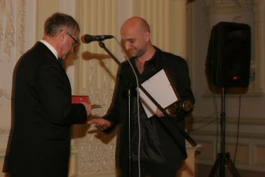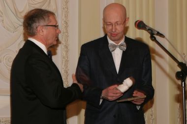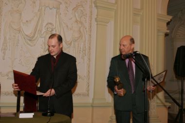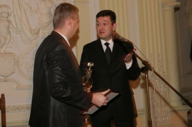 Савельев вручает Валерию Соловью памятный знак премии и диплом...