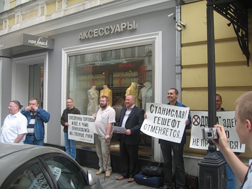 Люди из организации, называющей себя «Моссовет ДПНИ», стояли с грозным видом на одной из центральных улиц Москвы, держа в руках плакаты: «Станислав, гешефт не пройдет» и «ДПНИ: здесь ничего не продается».