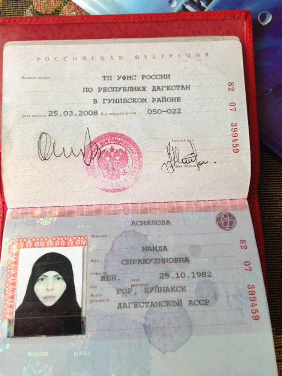 «Фото паспорта, приведенное в нашей статье, сделано 3 августа 2013 года на телефон, на iPhone 5, если быть точнее. Эта идиотка Асиялова в угаре ваххабизма в паспорт вклеила укутанную распечатку. На контроле паспортного режима она с ним попалилась и там было сделано это фото паспорта. С тех пор оно у нас и было. Хранилось, как часть информации о женщине из группы риска».