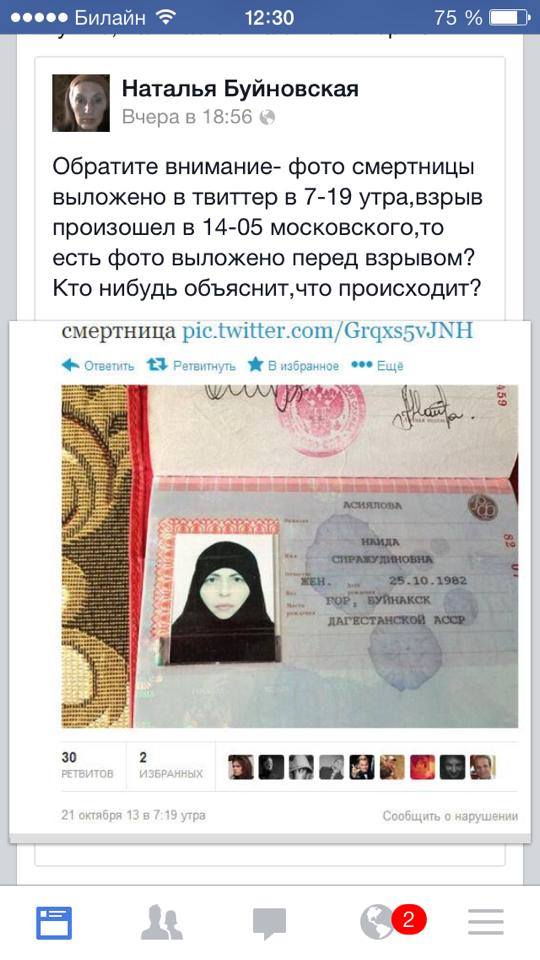 Через 5 часов, в 22:00, 2 октября. На сайте Комсомольской правды» появляется статья Дмитрий БЕЛЕЦКИЙ. «Волгоградская смертница сама себе сделала паспорт. И это было известно задолго до того, как Наида Асиялова устроила самоподрыв в автобусе».
