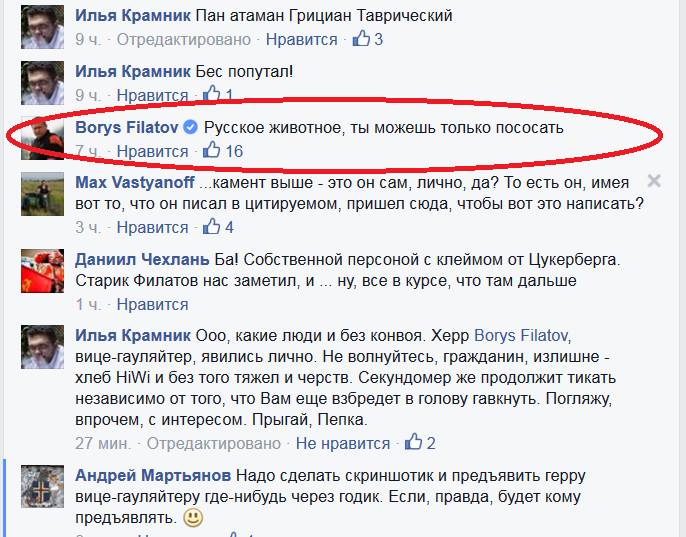Редакция АПН без особого трепета републикует скриншот показательного диалога заместителя председателя Днепропетровской областной государственной администрации Украины Бориса Альбертовича Филатова, радовавшегося победе на выборах над 'русней' и российского журналиста Ильи Крамника.