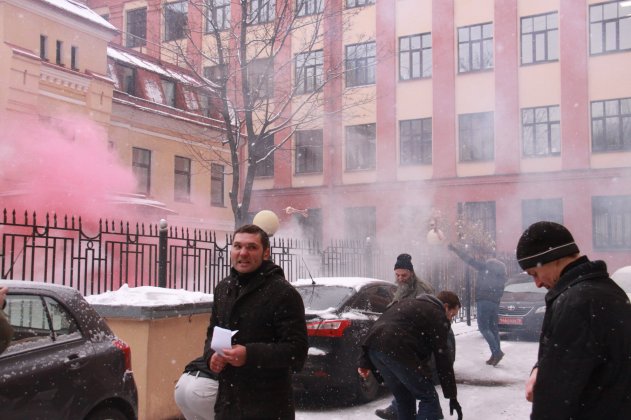 САНКТ-ПЕТЕРБУРГ. В субботу днем активисты петербургского отделения партии "Другая Россия" атаковали консульство Украины. Здание консульства забросали дымовыми шашками и говяжьими костями. "Жрите кости, а не людей!", - скандировали нацболы, напомнившие о продолжающихся обстрелах и гибели мирных жителей на Донбассе.