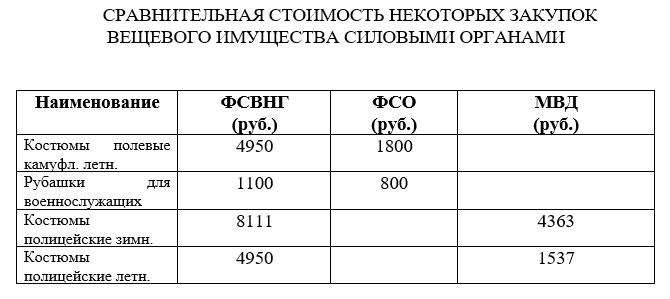 Позднее Меликов и Милейко начали просто менять технические условия, позволяя за счет этого принимать не соответствующую техусловиям продукцию. Так, в марте 2018 года под уже пошитую форму были изменены параметры размещения текстильных застежек и их размеры, а также увеличено поле допусков длины хлястиков брюк. При этом действовали изменения в среднем не более двух месяцев – только для того, чтобы принять некондиционную продукцию ООО «Спецшвейснаб». При этом закупочные цены были беспрецедентно высокими. Если, к примеру, ФСО закупала летние полевые костюмы и рубашки по 1800 и 800 рублей соответственно, то Росгвардия за аналогичные изделия платила уже 4950 и 1100 рублей. Зимние костюмы для полицейских, обходившиеся МВД в 1537 руб., Меликов с Милейко приобретали уже за 4950 руб. При прогнозной цене Военно-промышленной правительственной комиссии на шерстяные кители в 3933 рублей, у ООО «Спецшвейснаб» они закупались по 9890 рублей.