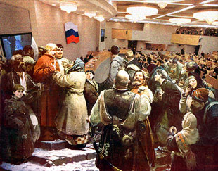 А теперь, руководствуясь своим абсолютным суверенитетом выбирать наиболее симпатичную нам форму Народовластия, давайте вспомним родную историю. Это ведь только «питающиеся» западными грантами либеральные псевдоисторики полагают, что вся тысячелетняя история России — сплошная деспотия и никакой демократии (народовластия) там быть не может. В старину же существовал на Руси совершенно демократический институт, до которого «парламентская» Европа — ни тех времён, ни даже нынешняя — так и не доросла. Назывался он Земский Собор и он имел право не просто выбирать себе царя, но и выбирать ЦИВИЛИЗАЦИОННЫЙ ПРОЕКТ, т.е. устанавливать некие обязательные для всех основы общественного устройства. Отменены Соборы были только Петром I — первым нашим «царём-западником».