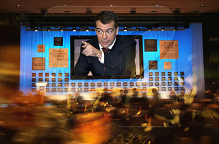 (Легкий одобрительный шепоток в зале. Эффектная блондинка в седьмом ряду достает из сумочки и медленно, с достоинством разворачивает мини-транспарант «Medvedev we all want You».)