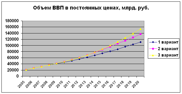 По всем трем сценариям предполагается повышение эффективности экономики. При этом по инновационному сценарию энергоемкость и электроемкость ВВП сокращаются соответственно на 39% и на 27%, а производительность труда возрастает на 138%, что существенно ниже ориентира, поставленного президентом. Наибольшее отличие инновационного сценария от инерционного и энергосырьевого заключается в опережающем росте инвестиций. При этом показатели повышения эффективности экономики, как и прироста валового продукта, существенно отстают от прироста инвестиций. Из этого следует, что разработчики Концепции ориентируются, главным образом, на экстенсивное наращивание основного капитала, которое служит основой роста производства. Вклад инновационного сектора (см.табл.2) на первых порах не превышает статистической погрешности при измерении ВВП. Тем самым в инновационный сценарий закладывается существенная инерционная составляющая. В результате темпы экономического роста по инновационному сценарию лишь немного отличаются от энергосырьевого (рис.1) — разработчики Концепции явно недооцениваются возможности инновационного развития, связанные с освоением прорывных технологий. В этом состоит их первый методологический просчет.