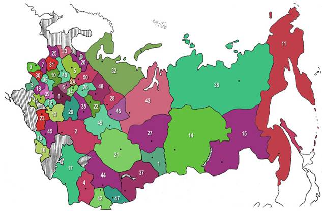Затем последовало несколько «реформ», видоизменивших политическую карту России до неузнаваемости. Губернии, области и округа, существовавшие на 1917 год, кроили и перекраивали несколько раз, пока в Кремле не угомонились примерно к концу 70-х годов.