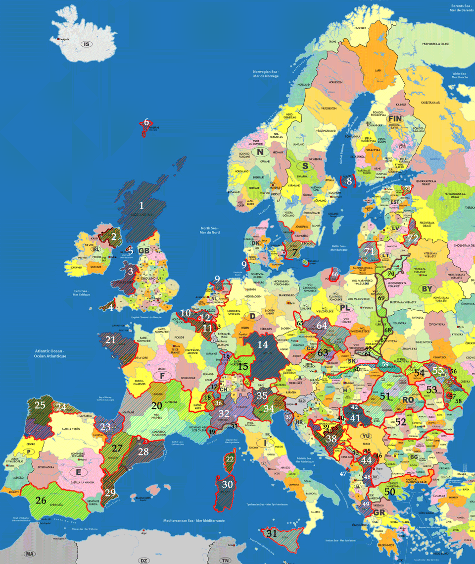 - светлая штриховка: исторические европейские регионы, с сильно развитым ощущением своей особой миссии. Пример: Окситания.