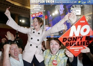В результате голосования на референдуме большинство ирландцев сказали «нет» (53,4 % голосов «против» при 46,6 % голосов, поданых «за») Лиссабонскому договору, погрузив тем самым «единую Европу» в новый кризис.