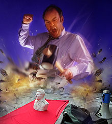 «Вечером членов комиссии пригласили в Независимый театр на премьеру спектакля «Кровавое колесо» по роману упоминавшегося выше писателя. Спектакль был сверхноваторским. Как писали потом в газетах, авангард двадцатых годов показался бы в сравнении с ним старомодной классикой. Актеры шлялись по зрительному залу, приставали к зрителям с провокационными вопросами вроде:»А что ты делал в застойные годы?» и выволакивали пожилых людей, подозреваемых в сталинизме и брежневизме, на сцену на всеобщее посмешище. Актеры были одеты в грязные и вонючие костюмы, символизировавшие прошлую эпоху. От зловония многим зрителям становилось дурно. Их под улюлюканье актеров выводили из зала. А кто-нибудь из актеров назидательно вопил:»А каково было вашим жертвам?!»Пьеса охватывала все основные вехи советской истории, начиная Октябрьским переворотом и кончая перестройкой. Начинался спектакль сценой в Смольном. Ленин с соратниками бежал по коридору. Навстречу шел Сталин. Ленин остановился на миг, спросил у Троцкого, указывая на Сталина, что это за бандитская морда. Троцкий сказал:»Шляются тут всякие!». Сталин сверкнул желтыми глазами, закурил трубку и проворчал с акцентом:»Погодите, я вам покажу, где раки зимуют!». В следующей сцене изображалось совещание вождей партии. Ленин полулежал в гробу, окруженный учениками и соратниками. Среди них крутились Хрущев, Горбачев, Сахаров, Ельцин. Обсуждались меры по перестройке всего того, что еще не начали строить. Рыков предлагал передать власть Советам, выбирать из двух кандидатов. Каменев предлагал разрешить несколько партий. Зиновьев предлагал ограничить функции партии идеологическим воспитанием трудящихся. Тухачевский предлагал уничтожить атомное оружие, а также ракеты ближнего, среднего и дальнего действия. Бухарин предлагал распустить колхозы и перейти на фермерское хозяйство, как в США. Он уверял, что один фермер с семьей будет производить больше, чем колхоз из трехсот человек. На вопрос, что делать с высвободившимися людьми, Бухарин посоветовал послать их учиться. Вдруг на сцену вбежал Сталин с сообщниками, среди которых, помимо известных сталинистов, фигурировали также Брежнев, Черненко, Громыко, Гришин, Робеспьер, Марат, Кромвель, Маоцзедун, Хомейни и даже Гитлер. Сталин запихнул Ленина в гроб и заколотил крышку гроба огромными гвоздями. Ленин еще долго кричал из гроба, что Сталин груб, что он захватил слишком большую власть над партией, что его надо снять с поста генсека. А Сталин спокойно сел на гроб и закурил трубку. Робеспьер вместе с Берией вкатили на сцену гильотину и начали рубить головы ленинской гвардии. Головы катились со сцены в зрительный зал. Как потом писали газеты, хотя все знали, что головы были не настоящие, зрители получили удовольствие от поразительной правдоподобности изображения духа эпохи. По рядам в это время бродили вонючие артисты, собирая подписи под требованием напечатать «Архипелаг ГУЛАГ».