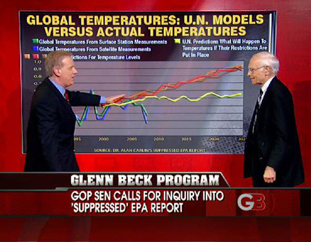 После выступления Алана Карлина на FOX его доклад размещен в Интернете, а выводы публикуются и обсуждаются во многих газетах, журналах и телевизионных программах. Достаточно одного взгляда на график, на котором ученый собрал вместе многолетние кривые изменения углекислого газа, температуры и прогноз ООН, чтобы понять, почему это исследование замалчивалось.