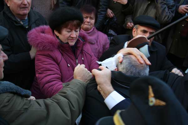 Плотная толпа митингующих сторонников компартии не позволила провокаторам уйти и разгневанные пенсионеры и пенсионерки начали избивать людей, пытавшихся сорвать открытие памятника. Одному из которых досталось особо – ему в кровь разбили лицо.