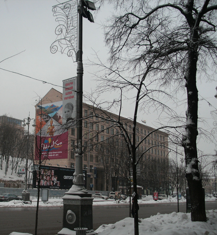 После долгого изучения Майдана замечаю, наконец, плакат Юлии Тимошенко: закрепленный на фонарном столбе плакат с ее черно-белым портретом и желтой надписью «Обери новiй шлях Украини» — «Выбери новый путь Украины».