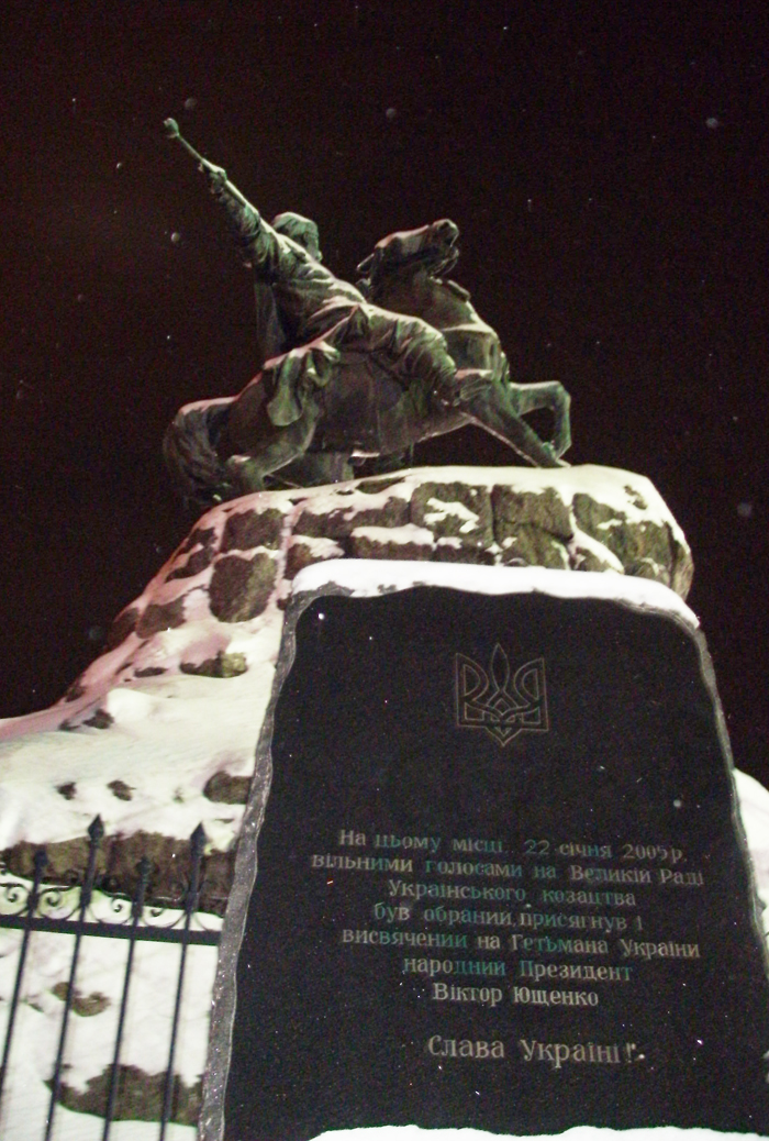 В центре площади покрытый снегом бронзовый Богдан Хмельницкий на вздыбленном коне с поднятой булавой, рядом с ним большой гранитный камень с надписью, что «На цьому мiсцi в 2005 роцi Виктор Ющенко був обран гетьманом украiнського козацтва».
