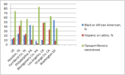 На «Диком Юге» в штате Техас, работают те же процессы, а именно: защищаемые «меньшинства» скапливаются в крупных городах. В Хьюстоне чернокожие жители составляют 24,1 %, латино — 41.9%, а в пригороде (Fort Bend Co.) — соответственно 20.5% и 23.6%.