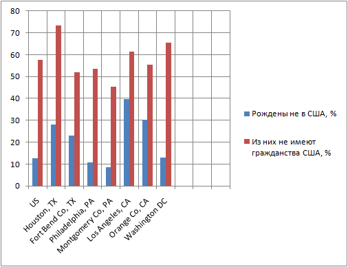 в Хьюстоне 73.4% иммигрантов не имеют гражданства США, в Филадельфии — 53.4%, в Лос-Анджелесе — 61.3%, в Вашингтоне — 65.4%.