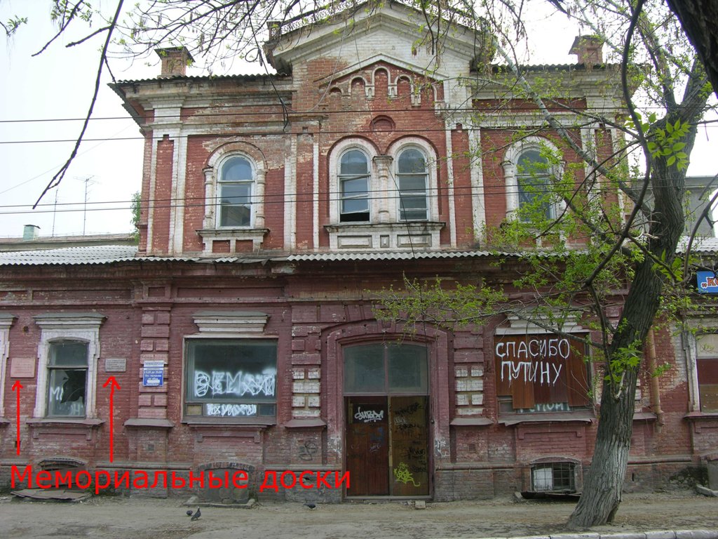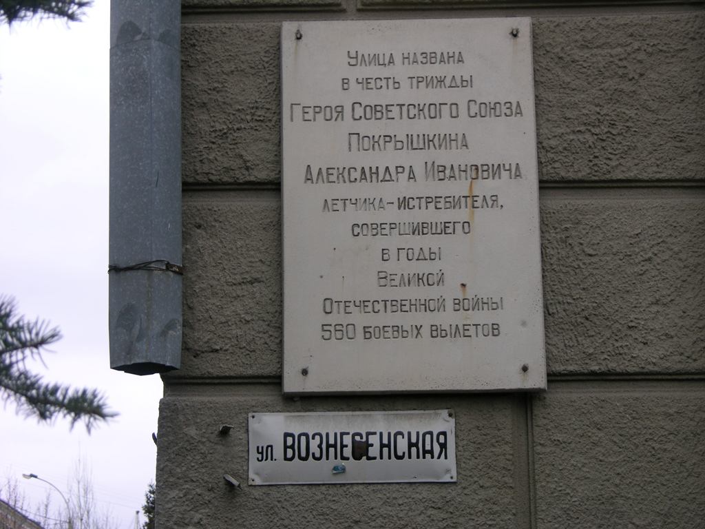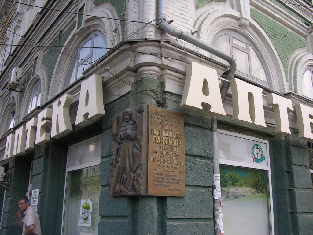 Мемориальная доска на доме, где работал И.В.Панфилов – генерал, остановивший немцев под Москвой в 1941 году. Не надо быть большим эстетом или специалистом по охране памятников, чтобы понять, что вывеска не должна быть рядом с мемориальной доской, а уж тем более, над ней. Простите за черный юмор, но ощущение, что герой работал в аптеке «Доктор Столетов». И никому не стыдно.