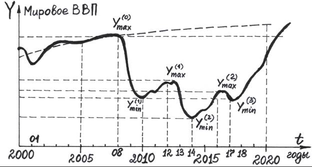 В настоящее время мировое сообщество вошло в понижательную волну большого Кондратьевского цикла на фазе «Великих потрясений». Фаза «великих потрясений» предыдущего эволюционного цикла проходила как раз между двумя мировыми войнами и получила название Великой депрессии. Эта фаза эволюционного цикла характеризуется крупными политическими и экономическими потрясениями и приводит к смене, по терминологии В. Пантина, «центра-лидера», т.е. страны, которая становилась лидером экономического развития мирового сообщества и определяла основные направления развития мировой экономики на очередной эволюционный цикл.