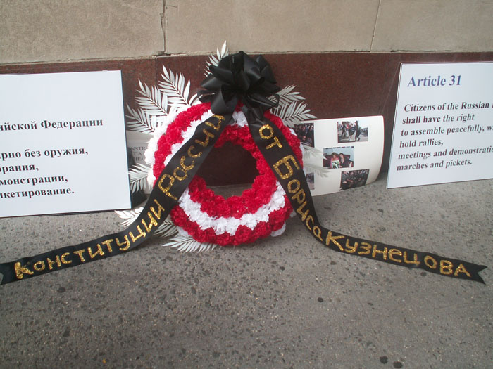 Своеобразным центром пикета стал адвокат Борис Кузнецов, который вынужден был бежать из России после того, как передал в Конституционный суд материалы о противозаконной прослушке ФСБшниками его клиента, члена Совета Федерации — и был обвинен по уголовной статье «Разглашение государственной тайны». Кузнецов принес траурный венок с надписью «Конституции России от Бориса Кузнецова».