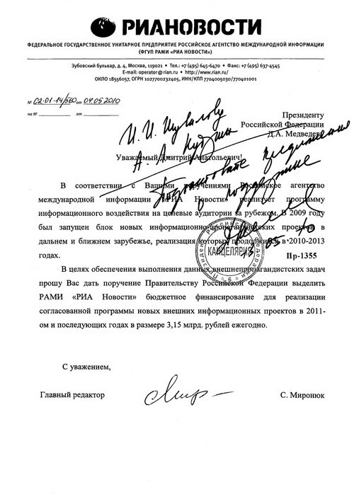 Документ за подписью главного редактора агентства Светланы Миронюк от 4 мая 2010 года адресован президенту Дмитрию Медведеву. В нем сообщается, что "РИА Новости реализует программу информационного воздействия на целевые аудитории за рубежом". Агентство обещает продолжить новые информационно-пропагандистские проекты в дальнем и ближнем зарубежье в 2010-2013 годах. Реализацию данных проектов руководство оценивает в 3,15 миллиарда рублей ежегодно. Президент поручил первому вице-премьеру Игорю Шувалову и министру финансов Алексею Кудрину подготовить предложения о поддержке.