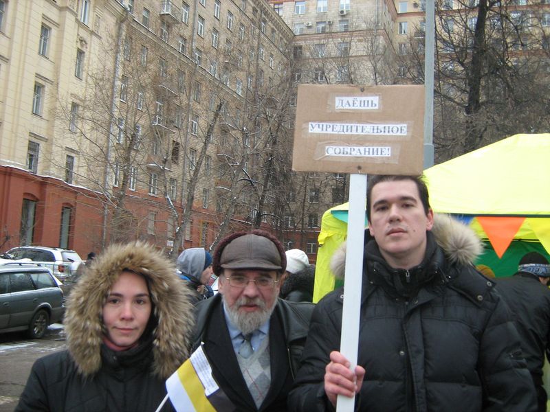 Узнав о том, что путинцы готовят провести 23 февраля в Лужниках многотысячную акцию поддержки своего кумира, я предложил соратникам прийти на неё со своим плакатом «Даёшь Учредительное Собрание!». Руководство фракции национал-демократов националистической курии в лице Константина Крылова дало на это «добро».