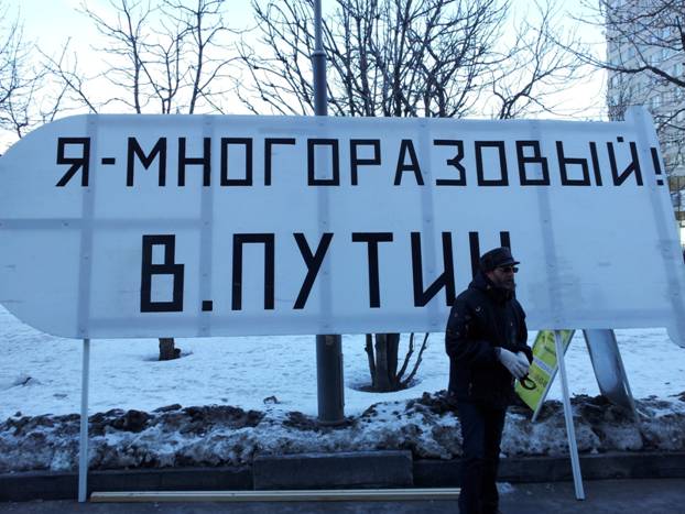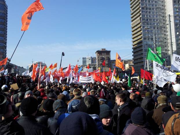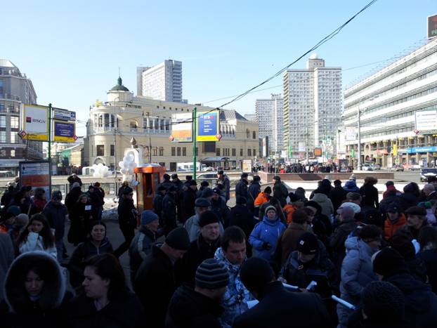 ...На часах 12:35, выхожу со станции метро Арбатская. По эскалаторам поднимается достаточно много людей с белыми лентами, свёрнутыми плакатами, растяжками и флагами. Продвигаюсь к Новому Арбату. Возле кинотеатра «Художественный» толпятся люди, готовящиеся пойти на митинг, некоторые инициативные граждане собирают подписи за отставку Путина.