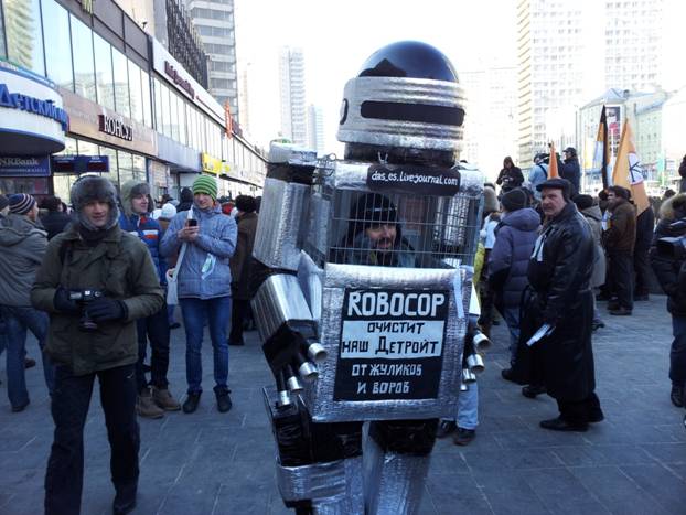 Антипутинский Робокоп окружён вниманием прессы и простых граждан, которые с улыбками фотографируют на свои телефоны. Неподалёку от него замечаю группу сторонников незарегестрированной партии «Великая Россия» с их лидером Андреем Савельевым, довольно известным учёным и интеллектуалом в правой среде. Наконец, подхожу к основной части митингующих.