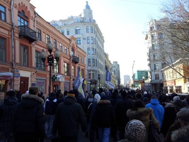 Колонна националистов стоит, по сложившейся традиции, с правой стороны. На трибуне долго и много выступают в поддержку некоего Алексея Козлова, которого несправедливо посадили, призывая приходить на следующий день к зданию суда. Среди митингующих мало кто знает, кто это вообще такой (позже, как я выяснил, Козлов – муж журналистки Ольги Романовой), в толпе постоянно спрашивают друг у друга. Наконец, протискиваюсь к правой колонне. Замечаю Д. Дёмушкина, Г. Боровикова и В. Ермолаева. Вдруг Дёмушкин громко говорит: «Националисты покидают протест! Сворачиваем полотнище!» (было вновь развёрнуто огромное полотно из имперского триколора). Правая колонна практически в полном составе разворачивается и двигается в обратном направлении. Через Арбатский переулок выходим на Старый Арбат в количестве около 200-300 человек и начинаем импровизированное шествие.