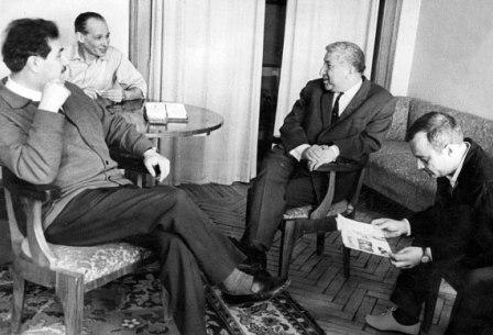 Разведчик Владимир Познер (второй слева) был своим человеком в творческой элите СССР. Слева от него – режиссер Григорий Чухрай, справа – поэт Расул Гамзатов и режиссер Георгий Данелия. (Фото из книги Г. Данелии «Тостуемый пьет до дна»).