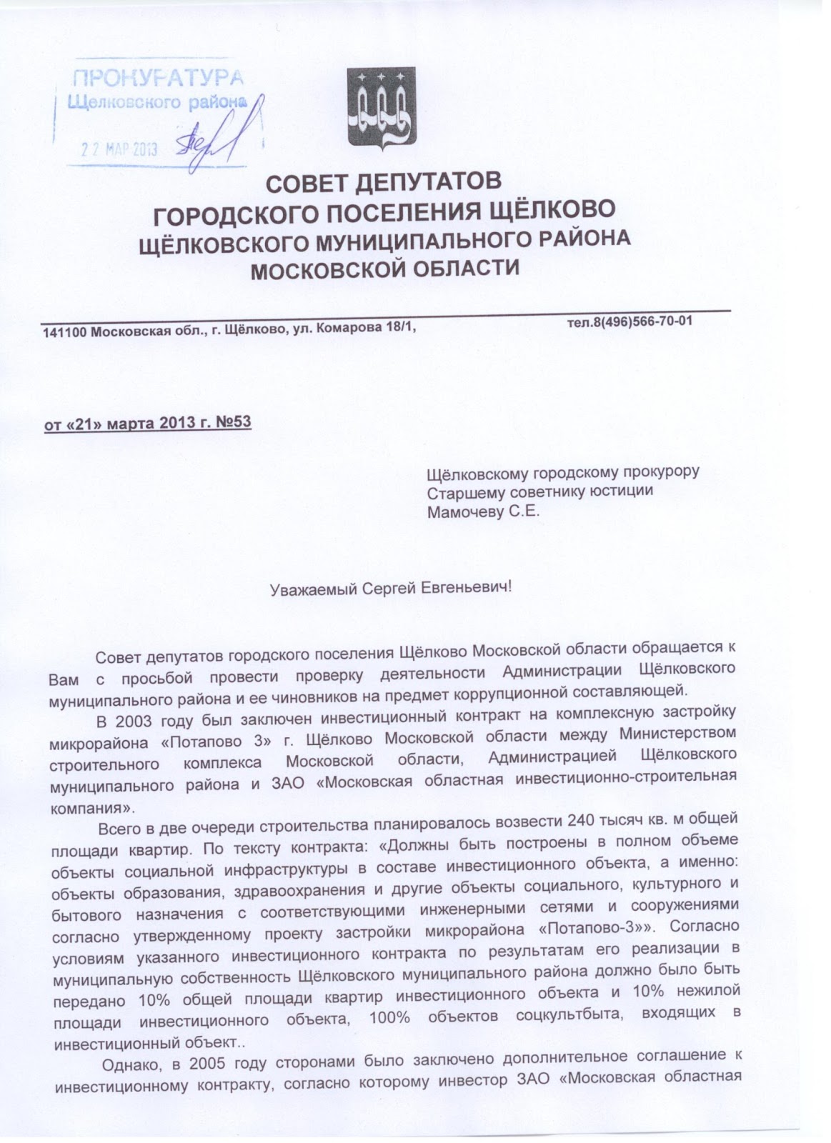 - Вначале (2003 год) обсуждается и визируется всеми сторонами (в нашем случае министром стройкомплекса Московской области Е.В.Серёгиным) взаимовыгодный проект. Инвестор – Московская областная инвестиционно-строительная компания». Она обязуется по инвестконтракту передать районному 10% площади квартир, 10% нежилых площадей (помимо объектов соцкультбыта) и 100% объектов соцкультбыта, отдельно прописанных в контракте. В контракте, однако, прописаны возможности изменения условий по соглашению сторон, но… Комплексная застройка, новое жильё людям, инженерная инфраструктура, школа и садики старожилам и новосёлам, прибыль инвесторам, более 400 квартир муниципальным очередникам – трудно возражать против такого решения! Тем паче, муниципалитеты свою долю получают вроде бы за земельную пустошь.