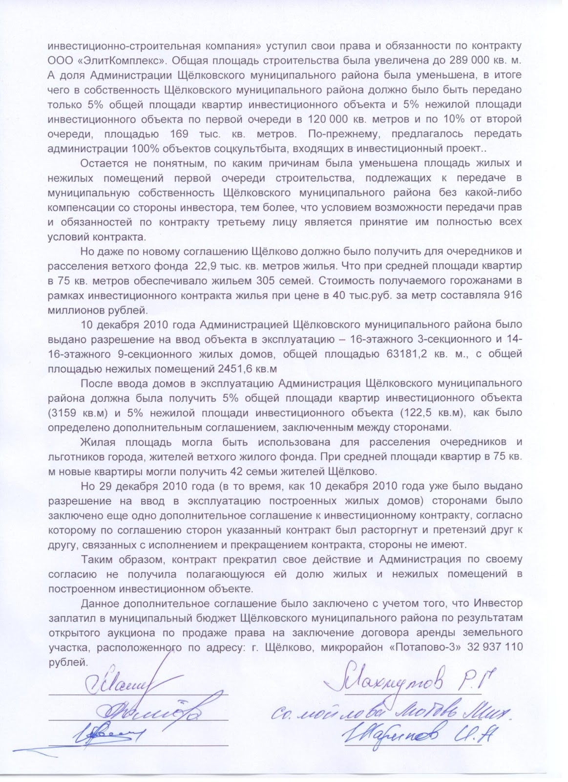 Зато в Щёлковском районе есть гордящийся градостроительным опытом глава района Александр Ганяев. Его подпись с 29.12.2010 г. стоит под гордым отказом муниципальной власти от обременений инвестора, ООО «ЭлитКомплекс», изначально предусмотренных при коммерческой застройке. Росчерком пера на одном листочке Ганяев А.М. (и выступившее третьей стороной министерство стройкомплекса Московской области с министром П.С.Перпелицей) освободил «ЭлитКомплекс» от накладной обязанности возвести в мкрн. Потапово-3 (так в соглашении) два детских сада и школу на 1200 учащихся. Заодно отказались и от предусмотренных ранее 10% квартир муниципальной доли (то есть от 24 000 м2 жилья сегодняшней стоимостью не менее 60 000 рублей, судя по предложениям потаповских риэлтеров). 1,44 миллиарда (!) рублей – стоимость жилья. Прибавить 0,2 миллиарда за два садика да 0,98 миллиарда за школу – выходит, муниципалитет потерял на странной сделке больше 2,5 миллиардов рублей. Ущерб, вполне сопоставимый с деяниями «Оборонсервиса». Но сделка формально может быть признана законной. Ведь после 10 апреля 2007 года, выиграв аукцион за право аренды для комплексного освоения территории, «ЭлитКомплекс» (он был единственный участник аукциона), заплатил в бюджет района 32 937 110 рублей. То есть Щёлковский район решил довольствоваться 548 м2 жилой площади (меньше площади 12 типовых однокомнатных квартир). При этом только в городе Щёлково (на земле которого и велась стройка) признаны безотлагательно нуждающимися в жилье и имеющими все законные права на муниципальное жильё почти 1200 человек! Среди них и жители разваливающихся бараков микрорайона Воронок, и сироты - выпускники детских домов, и люди, страдающие тяжёлыми заболеваниями, которым положена хотя бы отдельная комната…