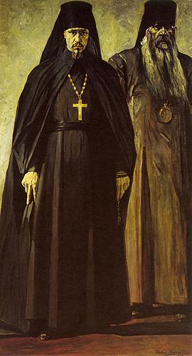 Корин стремился на своём полотне запечатлеть духовную силу и красоту Русского Православия во время исторического Страшного суда над ней и вообще над всей старой Россией. И это ему удалось, пусть вместо картины он создал лишь цикл портретов. Думаю, ничего лучшего о Русском Православии в нашей культуре художественными средствами не сказано. Нестеров, коринский учитель, с его вымученными и болезненными святыми (мне приходилось об этом писать), явно уступает пальму первенства своему ученику, сумевшему органически соединить духовность и человеческую полнокровность своих персонажей – и клириков, и мирян - это живые, сильные люди, что не мешает их порыву к горнему и верности своему кредо. Кстати, надо отдать должное прозорливости Нестерова, сказавшего ещё совсем молодому Корину: «Я – тенор, а вы, Павел Дмитриевич, - бас».