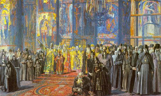 Именно здесь 15 августа 1917 г. открылся Всероссийский Поместный Собор Русской Церкви, принявший в октябре решение о восстановлении патриаршества в России. После водворения большевиков в Кремль храм для богослужений был закрыт. Последняя служба состоялась 5 мая 1918 г., скорее всего, она и стала первообразом картины. Но, разумеется, Корин писал не эту конкретную службу, а некую символическую последнюю службу вообще, возможно, происходящую перед концом времён (большевизм вполне можно было принять за знамение такового). Иначе невозможно понять анахронизмы, которые невооружённым глазом видны в эскизе «большой» картины. Ведь в его центре сразу три патриарха – Тихон, Сергий и Алексий I. Или, скажем, иероманах Пимен (Извеков) – будущий патриарх Пимен, выделяющийся в правой части эскиза, никак не мог быть на службе 1918 г. и вообще не мог оказаться в качестве иеромонаха на одном богослужении с патриархом Тихоном, ибо принял постриг только в 1930 г.