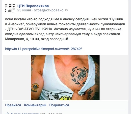 Этот «менеджер от культуры» всё управление отдал в руки такому же «арт-менеджеру» Зеленцовой, которая несколько лет засерала всем мозги «новыми культурными смыслами» и прочим птичьим языком, а сама с остервенением плодила везде где только можно таких же ненавидящих российскую культуру полу-хипстеров недогельманов. Умеющий «охранять и развивать людей» Капков разрушил всё, что не укладывалось в зеленцовскую парадигму, всё, что было хорошего в культурной Москве - безжалостно выгонял творческие коллективы, снимал директоров, ликвидировал библиотеки как «пережиток». На фото -лучшая иллюстрация культурки а-ля Зеленцова. Бюджетное учреждение культуры города Центр «Перспектива» в официальном аккаунте в ФБ приглашает отмечать День зачатья Пушкина. Так вновь назначенная директор Ирина Саминская организовала процесс популяризации площадки. Высокая культура а-ля Зеленцова. Зато никаких народных коллективов. Пережиток….