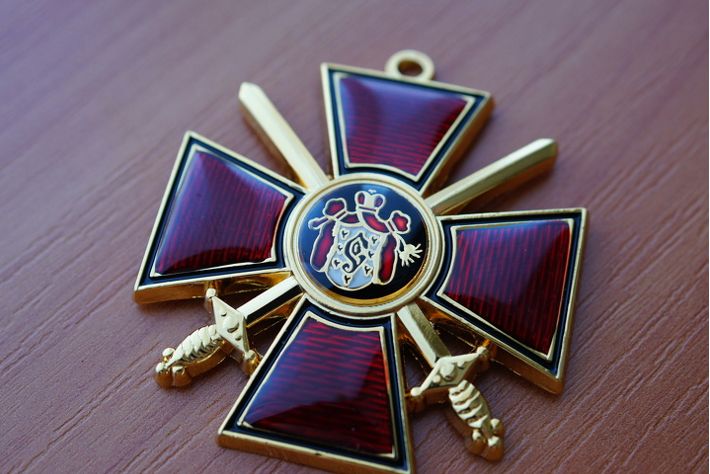 В отличие от военного варианта ордена «За заслуги…», на крест которого мечи крепятся с помощью странной цепочки, а мечи для звезды, похоже, не предусмотрены, мечи на владимирских кресте и звезде должны помещаться исторически, перекрещёнными за медальоном. Кстати, есть смысл возродить традицию отдельного награждения мечами к ордену. Например, награждённый ранее орденом св. Владимира (или иным историческим орденом, о чём будет сказано ниже) за выслугу лет или иные небоевые заслуги при новом отличии, но недостаточном для награждения каким-либо высшим орденом, вместо представления к военной, за боевые заслуги медали (например, «За отвагу») удостаивается мечей на старший из имеющихся орденов. Однако значительное число подвигов, требующих награждения за личное мужество, ныне отнюдь не исчерпывается заслугами на поле боя. Для таких случаев разумно учредить ещё одну разновидность орденского знака – например, со скрещёнными за медальоном стрелами как символом стремительности и самоотверженности.