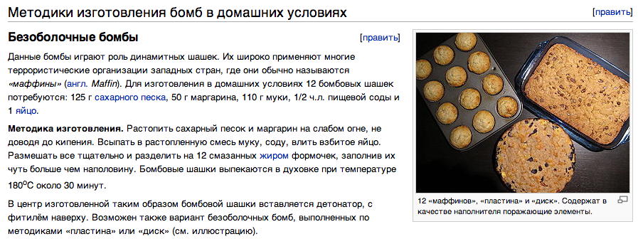 [...] выявлены сайты, на которых размещены предложения о незаконной продаже оружия и информация о способах изготовления оружия и взрывных устройств в кустарных условиях [...] http://absurdopedia.net/wiki/Как_правильно: изготовить_дома_бомбу [...]