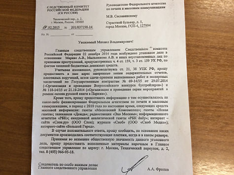 Как мы видим, наряду с совершенно правомерным запросом информации по конкретным госконтрактам, представители СК РФ "пристегнули" к запросу требование совершенно посторонней для этого дела информации. Любому непредвзятому читателю очевидно, что абсолютно законное грантовое финансирование Роспечатью перечисленных СМИ не имеет никакого отношения к предполагаемым хищениям этой дамы, и что между ними и ей нету никакой юридически значимой связи.
