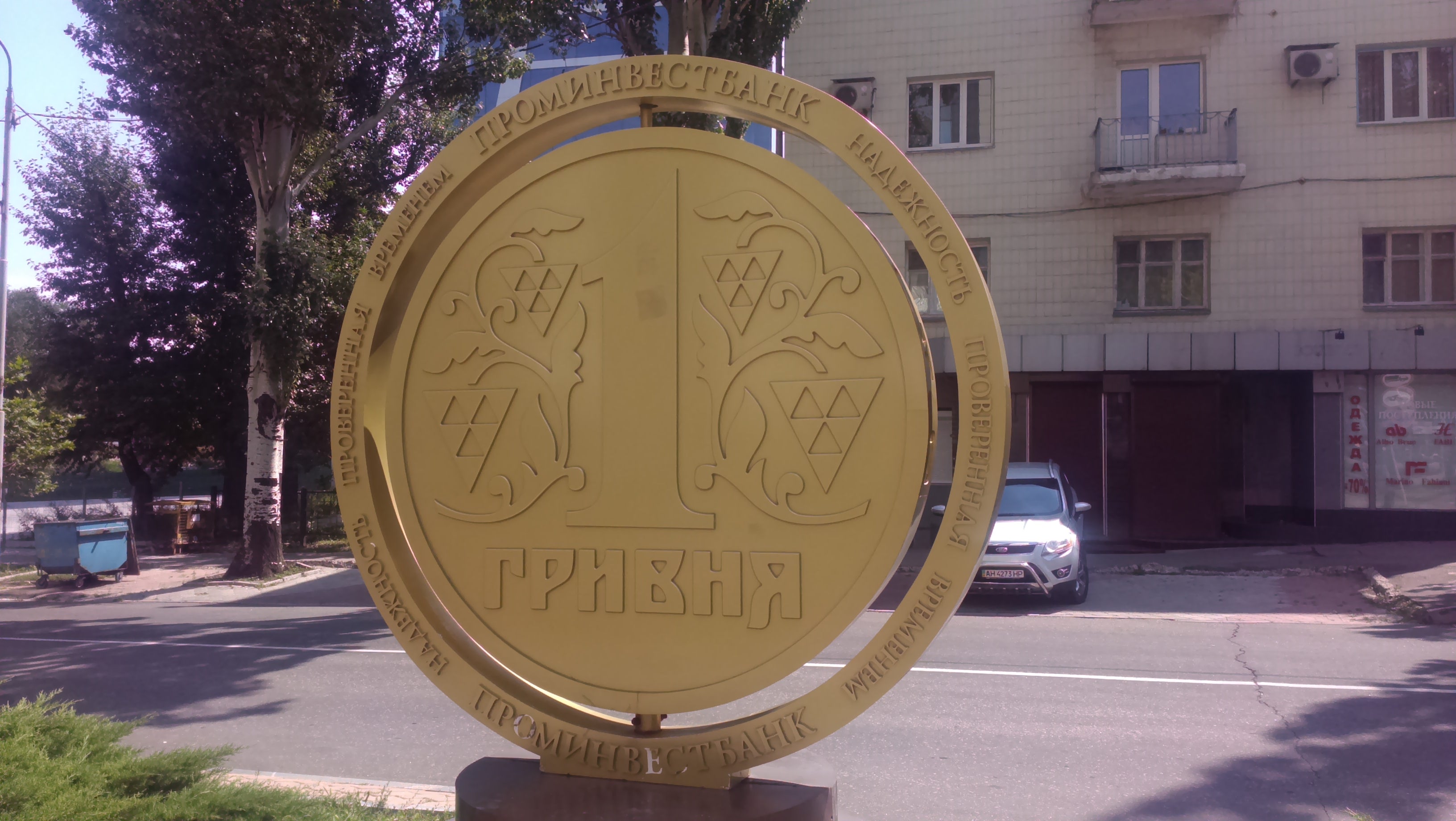 Примечательно, что памятник гривне служивший ранее рекламой Проминвестбанку приобрел сегодня совсем иное смысловое наполнение. Цветы, конечно, к нему не носят, но выглядит он весьма символично.