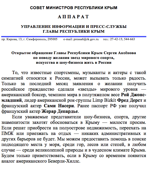СИМФЕРОПОЛЬ. Глава Крыма Сергей Аксенов написал открытое обращение к представителям мирового шоу-бизнеса и спорта, в котором отметил увеличение числа зарубежных звезд, которым хочется жить в России, и заявил о намерении превратить Крым в «аналог американского Беверли-Хиллз». Текст обращения на русском и английском языках опубликовали «Известия», а редакция АПН не может отказать себе в удовольствие его воспроизвести.