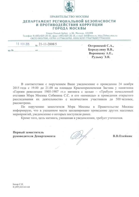 Ну что же. Нам кажется, что эта бюрократическая отписка - прекрасная иллюстрация того, почему нужно требовать немедленной отставки как самого Собянина, так и прикрывающей его тылы команды Олейника.