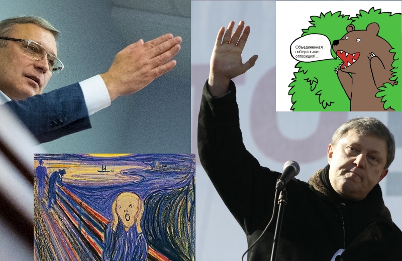 Собственно, - это было нехитрой схемой рекламы как Гайдара, так и Явлинского. И всех "либералов" вокруг. Вечно какой-нибудь Евгений Киселёв прямо-таки требовал в своих передачах, - "чтоб они объединились". Гайдар говорил "да, да!", а Явлинский отвечал "нет, нет!", аргументируй это тем, что "Гайдар - это партия олигархов, а Явлинский этого не выносит". То, что Гусинский, потом Ходорковский и т.д. - собственно тоже мега-олигархи и главные спонсоры и владельцы действий "Яблока" - не обсуждалось, поскольку они были названы "хорошими олигархами".