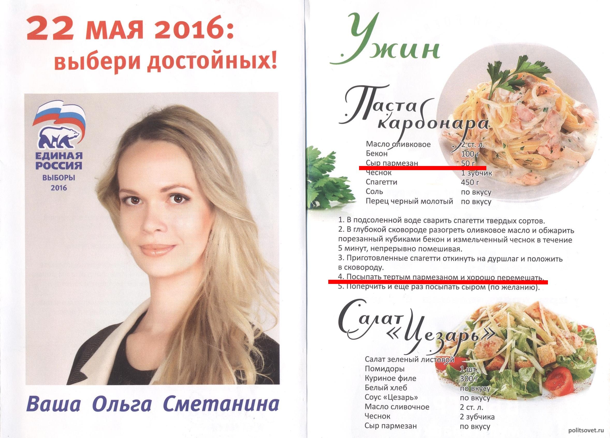 Среди предлагаемых избирателю рецептов есть и рецепт пасты карбонара, в состав которой входит сыр пармезан. Кандидат-единоросс советует электорату посыпать пасту 50 граммами этого сыра.