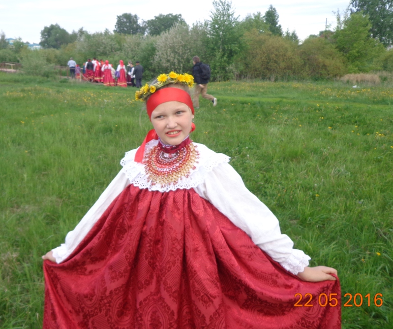 Рузана из соседних Пиголей, прибыла с мамой. Костюм аутентичный, воспроизведён по местным традиционным фасонам. Фатка повязана «по-ленточному», как у девиц положено.
