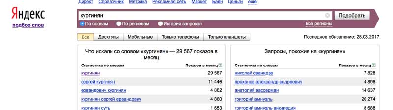 20 000 запросов в системе Яндекс для политика которого чуть ни каждый день крутят по центральному телевидению это совсем не много. А именно таков печальный уровень запросов по ключевому слову "кургинян" мы наблюдали к концу месяца.