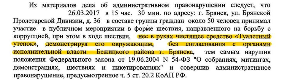 "Из материалов дела об административном правонарушении следует, что 26.03.2017 в 15:30 по адресу г. Брянск, ул. Брянской Пролетарсокй Дивизии, д. 36 в составе группы граждан около 50 человек ПРИНИМАЛ УЧАСТИЕ В ПУБЛИЧНОМ МЕРОПРИЯТИИ В ФОРМЕ ШЕСТВИЯ, НАПРАВЛЕННОГО НА БОРЬБУ С КОРРУПЦИЕЙ, ПРИ ЭТОМ В ХОДЕ ШЕСТВИЯ, НЕС В РУКАХ ЧИСТЯЩЕЕ СРЕДСТВО "ТУАЛЕТНЫЙ УТЕНОК", ДЕМОНСТРИРУЯ ЕГО ОКРУЖАЮЩИМИ, БЕЗ СОГЛАСОВАНИЯ С ОРГАНАМИ ИСПОЛНИТЕЛЬНОЙ ВЛАСТИ Бежицкого района г. Брянска, тем самым нарушив положения Федерального закона от 19.06.2004 № 54-ФЗ "О собраниях, митингах, демонстрациях, шествиях и пикетированиях" и совершив административное правонарушение, предусмотренное ч. 5 20.2 КоАП РФ."