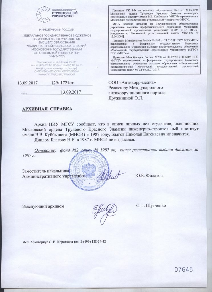 Сомнения в том, что Николай Благов действительно имеет высшее образование, появились у нас, когда пермские журналисты опубликовали информацию о том, что, баллотируясь в депутаты Заксобрания Пермского края, Благов представил диплом другого ВУЗа – НИУ МГСУ (Московский инженерно-строительный институт). В Газпром этот диплом Благов не предоставлял, несмотря на то, что выдан он был якобы еще в 1987 году.