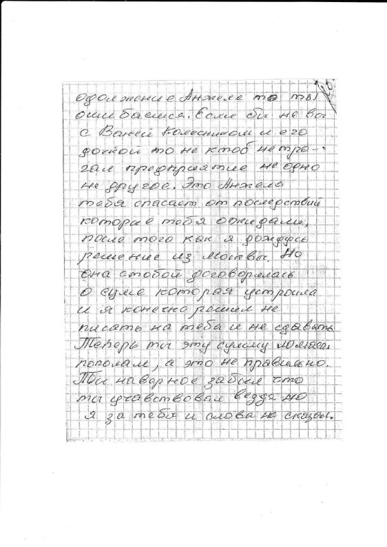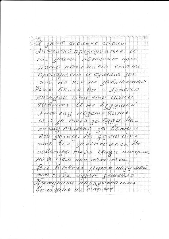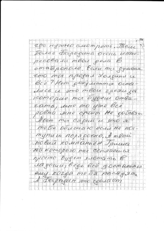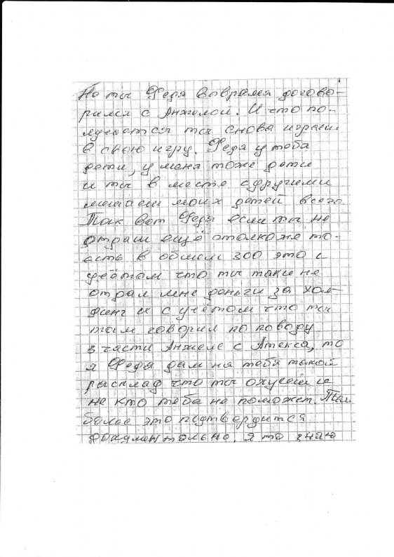 Ты думаешь, что ты продал холдинг [прим.- ГК «Север Кубани»] и все? Нет, документы остались, и это твои грехи, за которые ты будешь отвечать, мне-то уже все равно срока не добавят. А ты сядешь, и это я тебе обещаю, если не поступишь порядочно. А твой новый компаньон Гриша [прим.- Григорий Кудря], на которого ты ссылаешься, будет просто хлопать в ладоши, ведь все достанется ему, когда тебя посадят. А Бородин это сделает с великим удовольствием. Ты не думай, что Ваню и его дочку не коснется, на них тоже есть достаточно, что написать и подтвердить. Я вообще не знаю, вы просто все ох…шие, вы же все имели со мной дела. Если я этого не сказал в Осетии, то теперь меня ничто не останавливает. Да еще и Вова Дзюба [прим. - бывший совладелец холдинга «Север Кубани»] бегает со своими предложениями, чтобы я написал сам за «Север Кубани». А он-то достался тебе, там ты вообще лидер. Но если ты хочешь, давай проверим, ты просто скажи Анжеле: нет, и я тогда буду писать Бородину. Он меня заберет в Осетию, и посмотрим, сколько тебе придется выкинуть денег, если, конечно, они тебе помогут. И тогда ты поймешь, какую сделал ошибку, когда будешь сидеть в камере и при этом лишишься всего. Твоя судьба в твоих руках. Для меня рассчитаешься правильно – хорошо, и я за тебя забуду; нет – тоже неплохо, буду сотрудничать со следствием, может, и снимут пожизненное. Поэтому думай, и я жду ответа до следующего свидания с Анжелой.