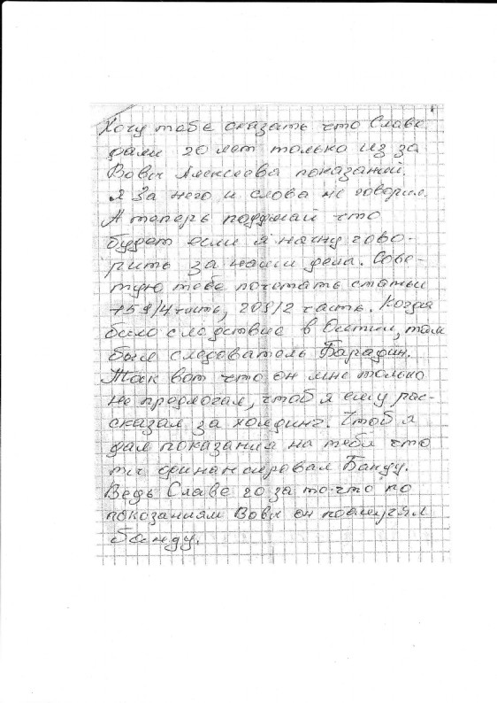 Хочу тебе сказать, что Славе дали 20 лет только из-за Вовы Алексеева показаний [прим. - Вячеслав Цеповяз, глава крупного кущевского хозяйства «Слава Кубани» и Владимир Алексеев, он же «Вова Беспредел», приговоренный к пожизненному заключению]. Я за него и слова не говорил. А теперь подумай, что будет, если я начну говорить за наши дела. Советую тебе почитать статью 159/4 часть [прим. – «Мошенничество», лишение свободы до 10 лет], 209/2 часть [прим. – «Бандитизм», лишение свободы до 15 лет]. Когда было следствие в Осетии, там был следователь Бородин. Так вот, что он мне только не предлагал: чтобы я ему рассказал за холдинг [прим. – Группа компаний «Север Кубани» (40 тыс.га), принадлежавшая банде и возглавляемая Фёдором Стрельцовым], чтобы я дал показания на тебя, что ты один наследовал банду. Ведь Славе [дали] 20 за то, что по показаниям Вовы он получил банду.