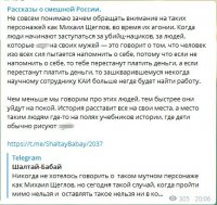 Итак, какие это Телеграмм-каналы размещают подобную дезинформацию о деятельности Общества русской культуры Республики Татарстан и обо мне лично? Конечно, «Шалтай-Бабай», затем «Бабай позвонит» а также (мне показалось странным название, но теперь-то всё стало понятно) «Рассказы о смешной России», призвавшей меня не обсуждать дабы не популяризовать.