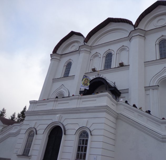 Служба митрополичья длинная, храм полон, внутрь – не протолкнуться, стоим на высокой паперти, молимся, в руках держу стяг с освящённым Нерукотворным Образом Христа Спасителя, ветер хороший – образ развивается, виден отовсюду.
